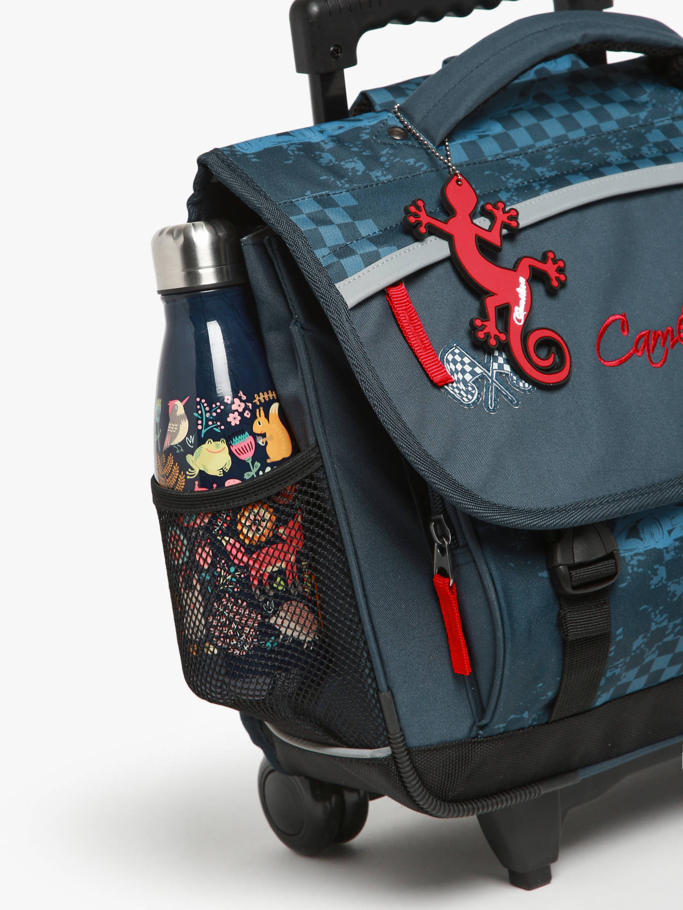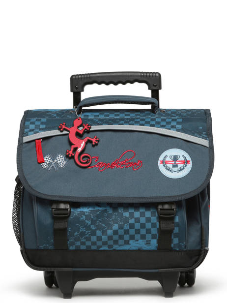 38 cm - 15 litres - 2.3 kg ~ Cartable enfant à roulettes 38 cm de la ligne Actual signé Caméléon. Convient parfaitement pour les classes de CP, CE1 et CE2. Son intérieur comporte deux compartiments, parfaits pour accueillir les cahiers format 21x29,7 cm, 24x32 cm et les classeurs A4. Une grande poche zippée ainsi qu’un emplacement spécial règle sont également intégrés. Ce cartable se ferme à l’aide d’un rabat et de deux fermoirs solides. Il dispose de deux poches extérieures à fermeture éclair, pratiques pour le goûter et les petits effets personnels. Un emplacement pour la gourde est prévu sur le côté. Confortable et résistant, le dos et les bretelles sont rembourrés, et le fond est renforcé. Pour passer en mode trolley, les bretelles peuvent être rangées dans une poche prévue à l’arrière du cartable. Une protection rembourrée au dos a été pensée pour éviter tout contact direct avec l’armature des roues et protéger le dos des enfants. Ce cartable est fabriqué en polyester recyclé imperméable. Côté sécurité, des bandes réfléchissantes sont placées autour du cartable. Petit plus : une règle est offerte !